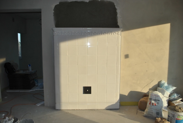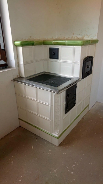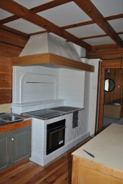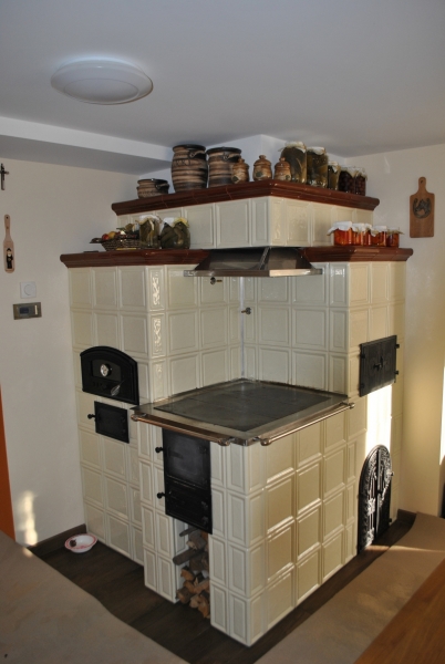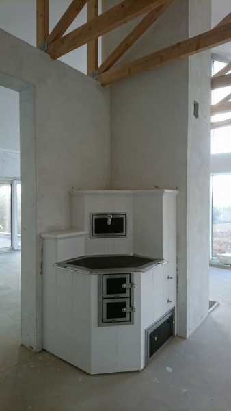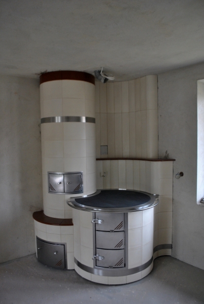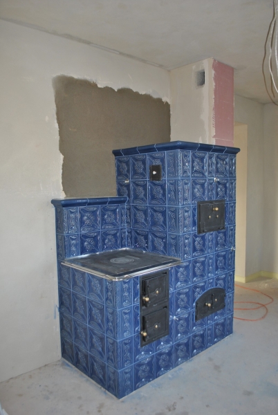 Kuchnia kaflowa z ceramiki w kolorze jasnego kobaltu. Piec kuchenny posiada bratrurę, w górnej części, niezależny piec chlebowy oraz długi obieg grzewczy, dzięki któremu grzana jest tylna ściana. Zastosowano żeliwne płyty grzewczę z której jedna jest z fajerkami umożliwiającymi przygotowanie dań nad ogniem. Cała konstrukcja funkcjonuje na jednym kominie do którego poprzez system zasuw i szybrów jest kierowany dym z paleniska. projekt: Marcin Deręgowski