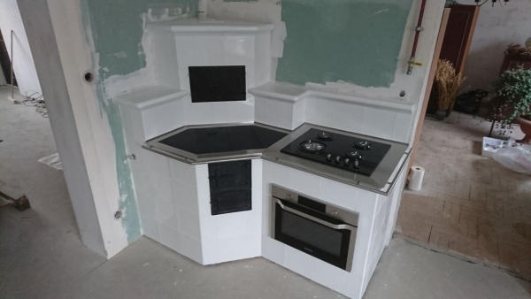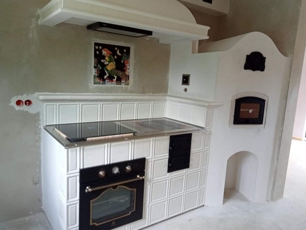 Kuchnia kaflowa z białych gładkich kafli. Płyta grzewcza połączona z panelem gazowym i piekarnikiem. W narożniku bratrura (dochówka). projekt: Marcin Deręgowski