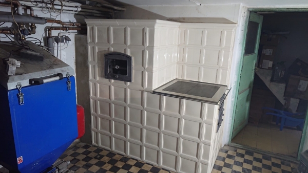 Kuchnia kaflowa z kafli kafel-kar z bratrurą po lewej stronie. Kuchnia zbudowana w kotłowni w razie W. projekt: Marcin Deręgowski